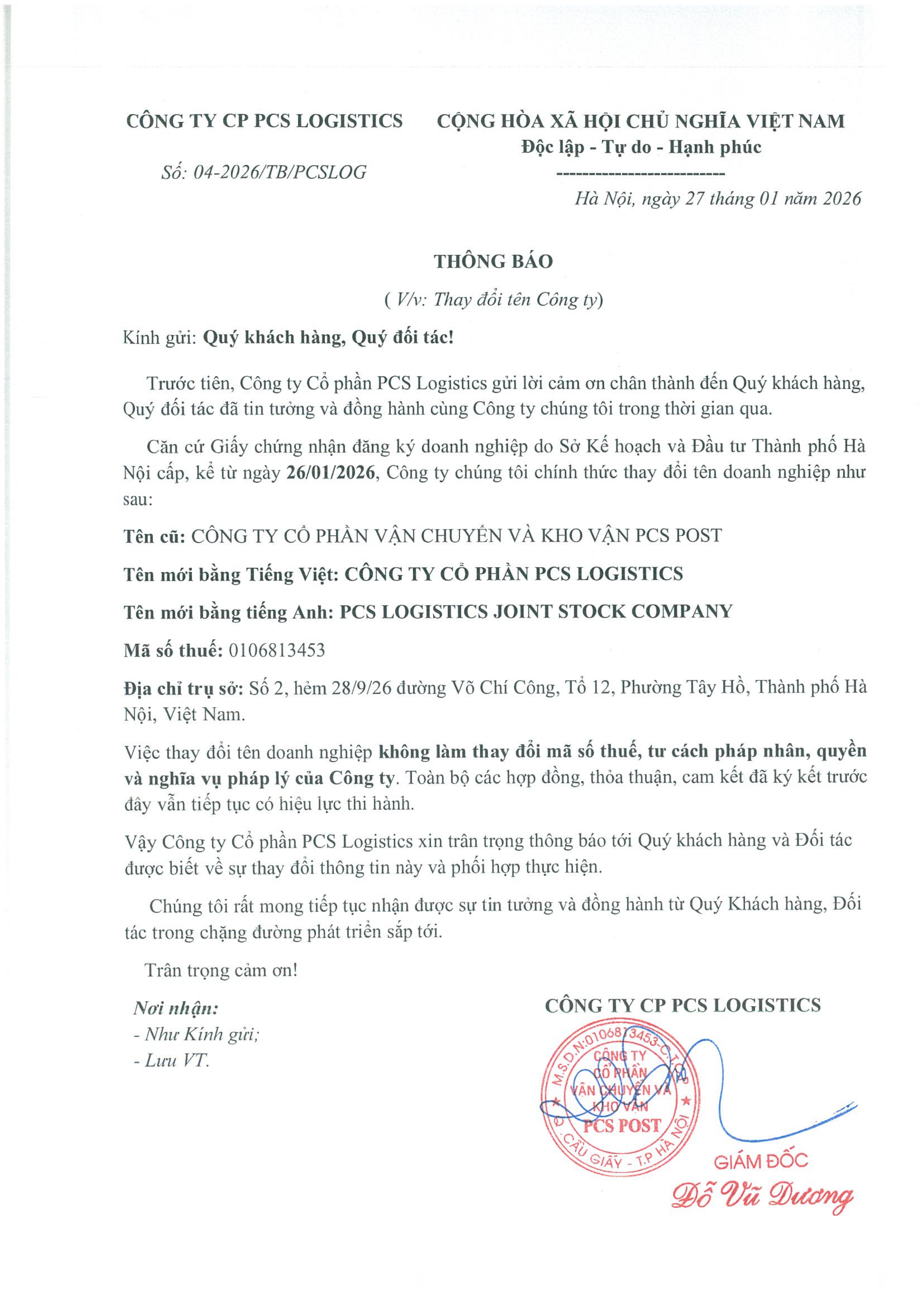 1. PCS Post chính thức đổi tên thành PCS Logistics từ 26/01/2026